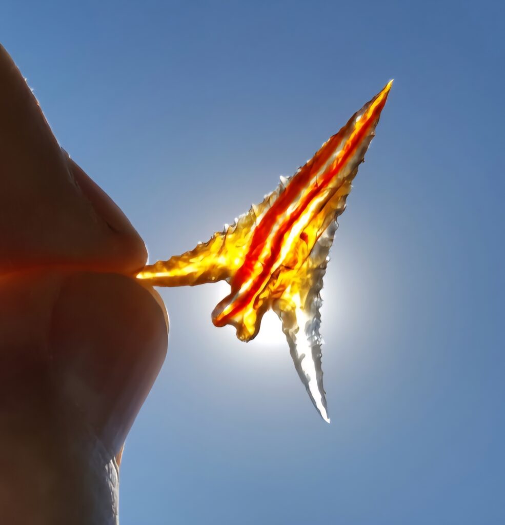 “Lightning and Fire” flintknapped northern side-notched style arrowhead.
