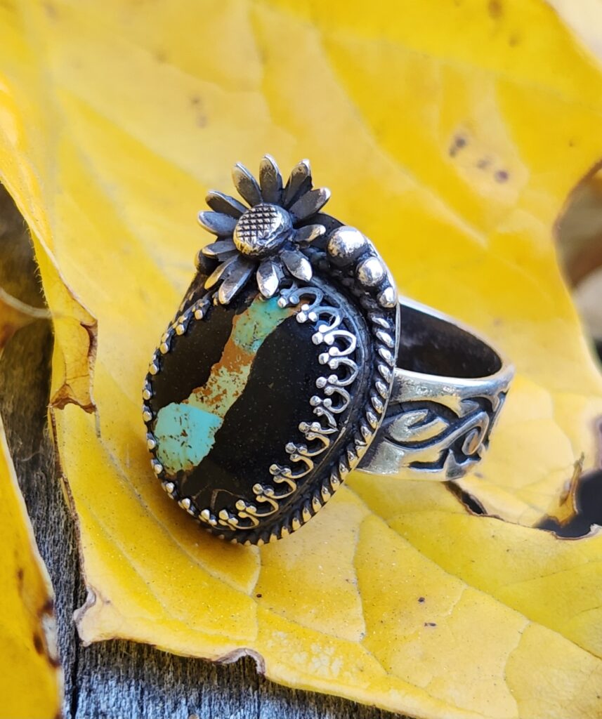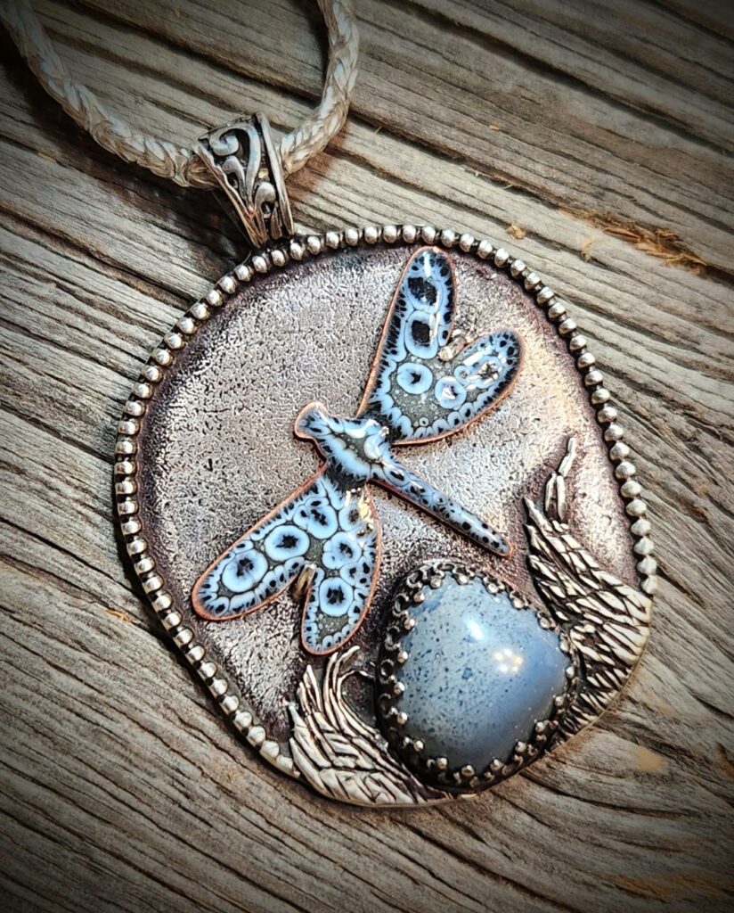 Recognizes the best representation of the themes “Desert and Water” in the form of 3D art, for “Desert Reflections” sterling silver necklace with a Tecopa desert pupfish and Royston turquoise cabochon.